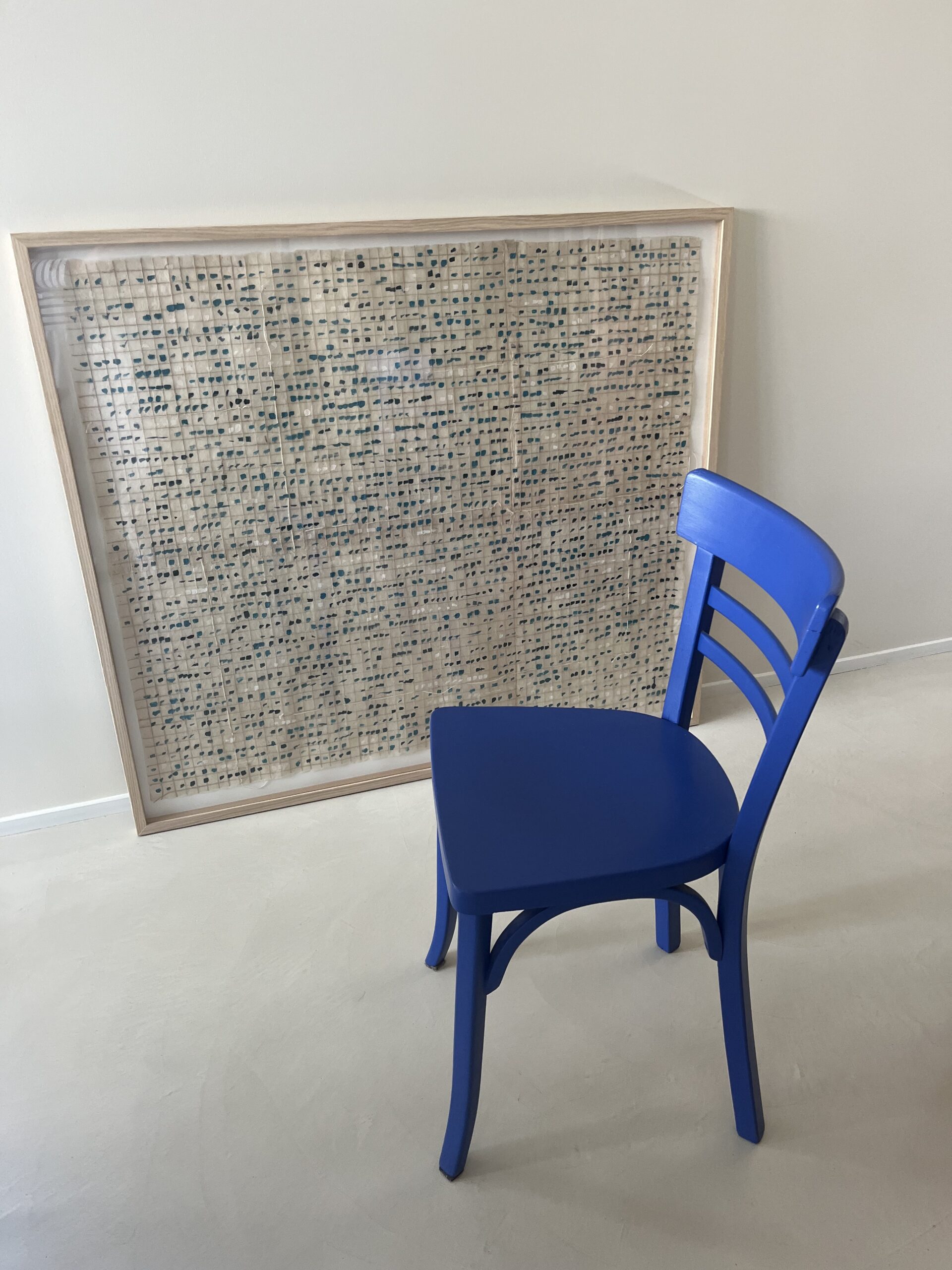 … Son écriture inventée qui reste ouverte tant dans sa formulation que dans son déchiffrement, se présente au spectateur comme un manuscrit abstrait. Elle apparaît comme l’écho d’une langue dont le sens a été perdu – ou n’a jamais existée – et invite le spectateur à comprendre que voir est en soi un acte de lecture.