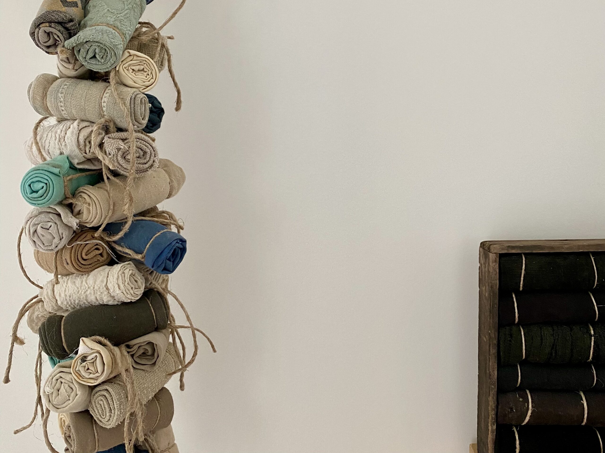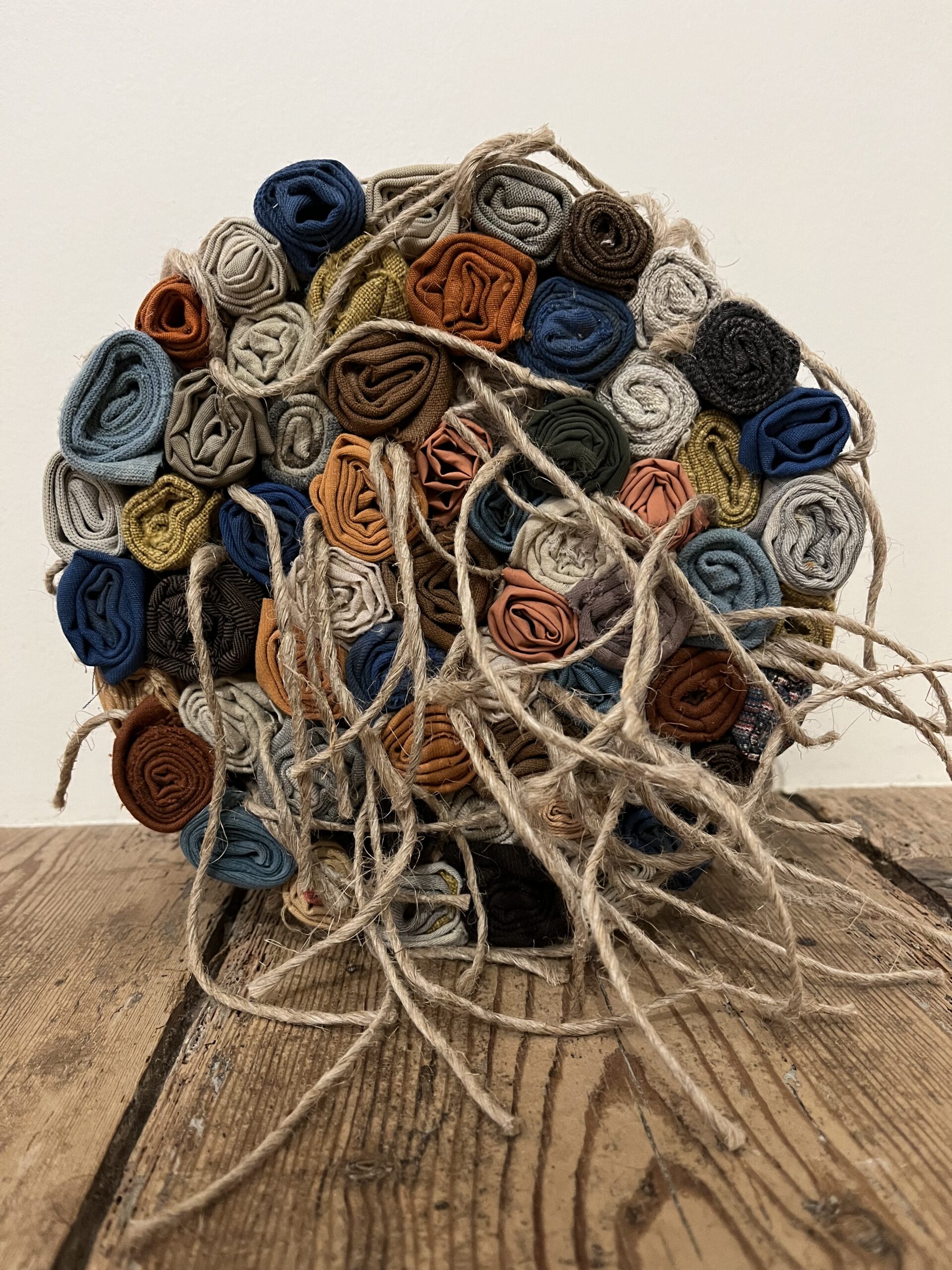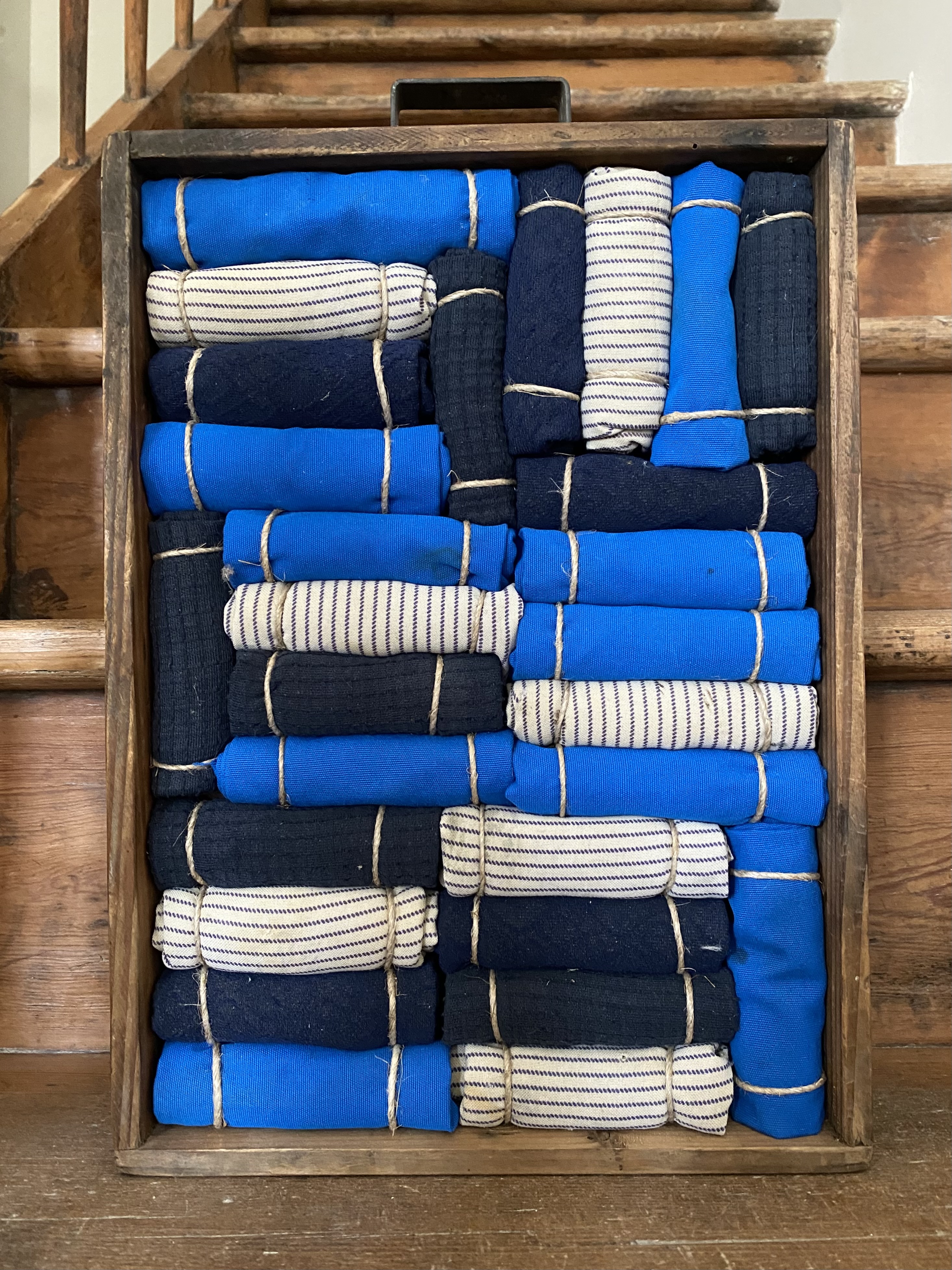 Ma collecte : des tissus échoués, chiffons abandonnés par la mer dans le sable, fragments de mémoire, vêtements élimés venus du large, vestiges d’un monde flottant.
